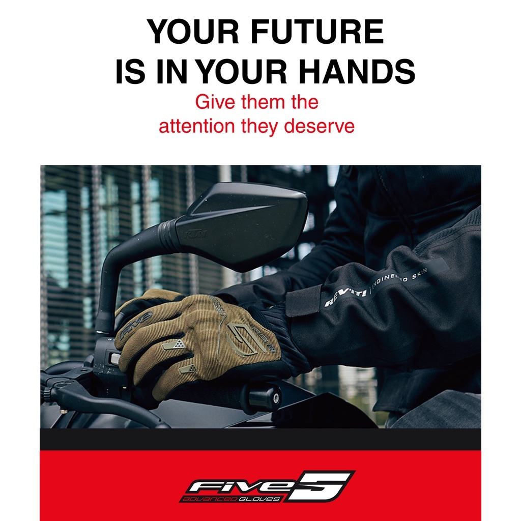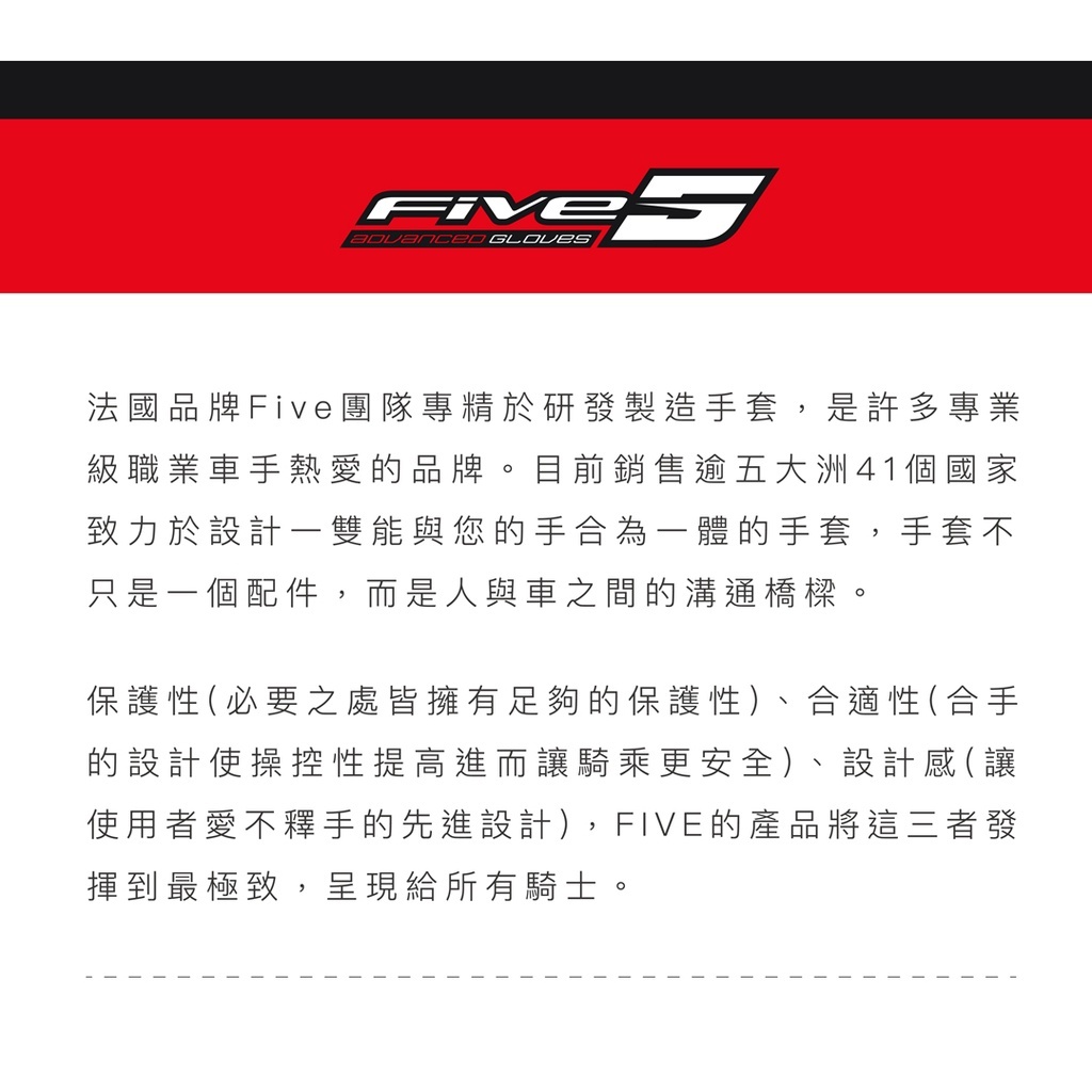 來自法國的頂級工藝手套-Five5,讓你享受跟頂級賽車手一樣的全方位保護,法國品牌FIVE團隊,專精於研發各式機車手套,是許多專業級職業車手熱愛的品牌。從摩托車賽車、街車、越野車到一般速克達,專門為各種不同風格的騎士設計,兼具防護力、舒適性、時尚設計,讓手套進化成一種時尚潮流配件,突顯不凡品味。