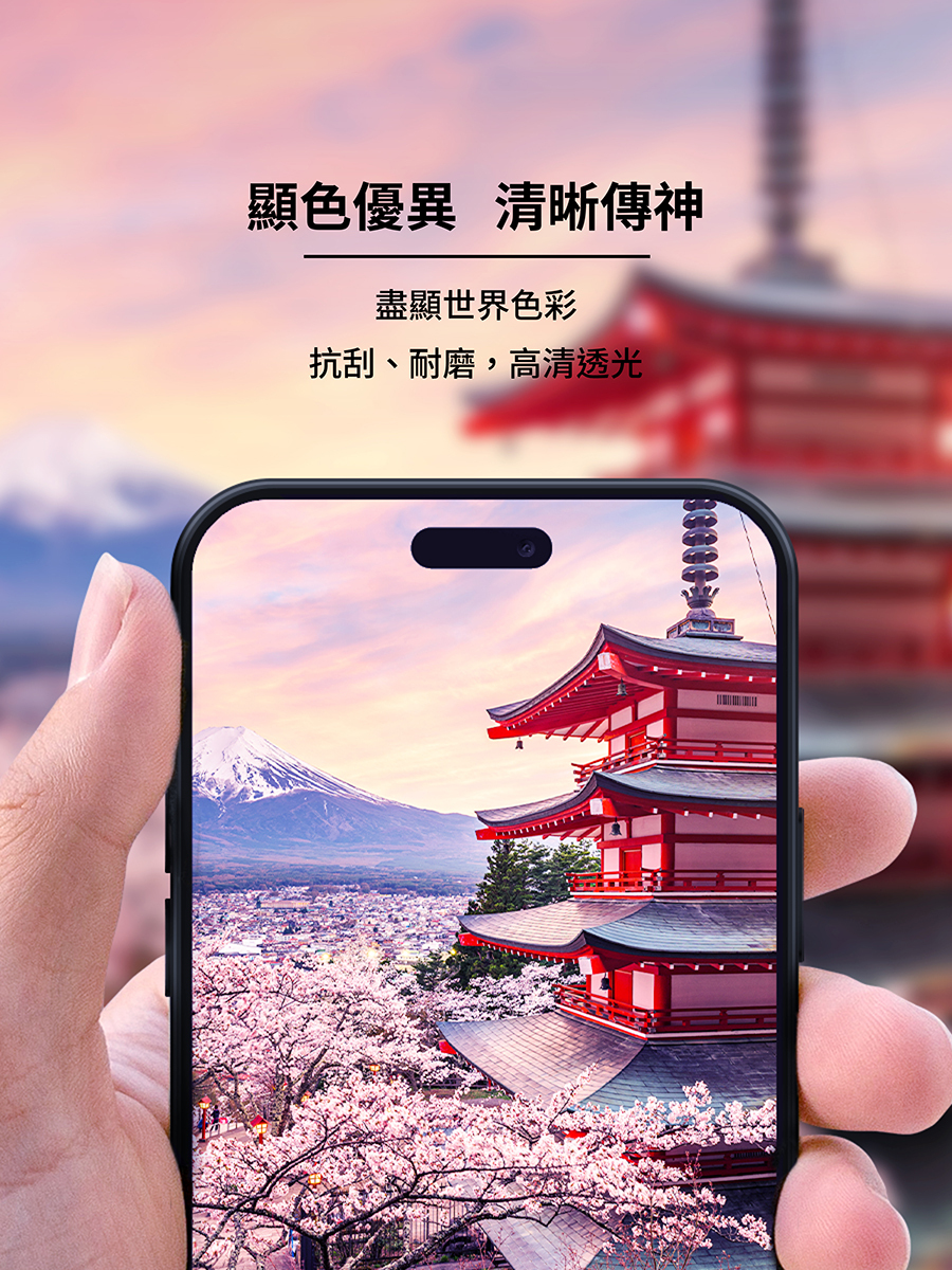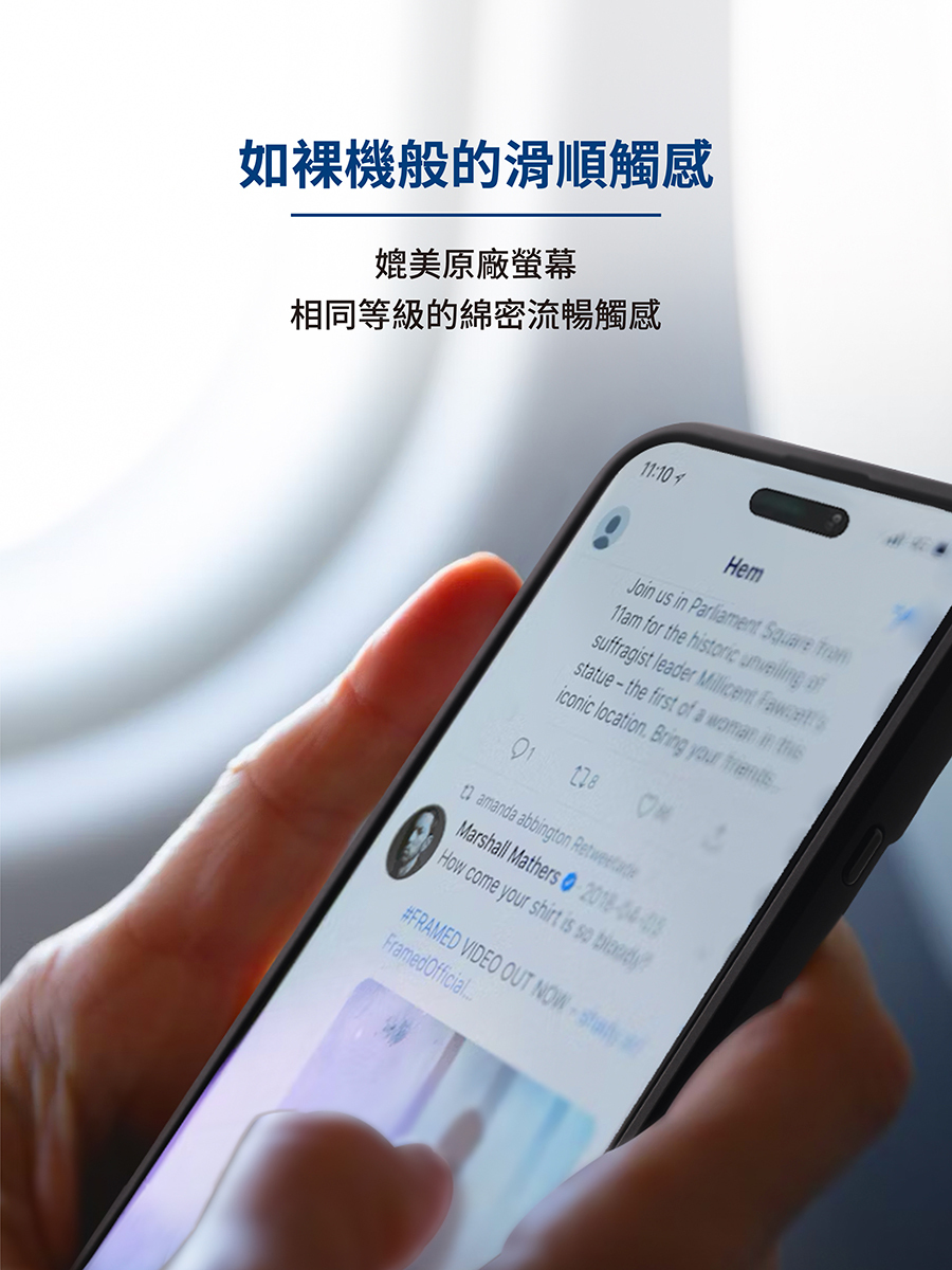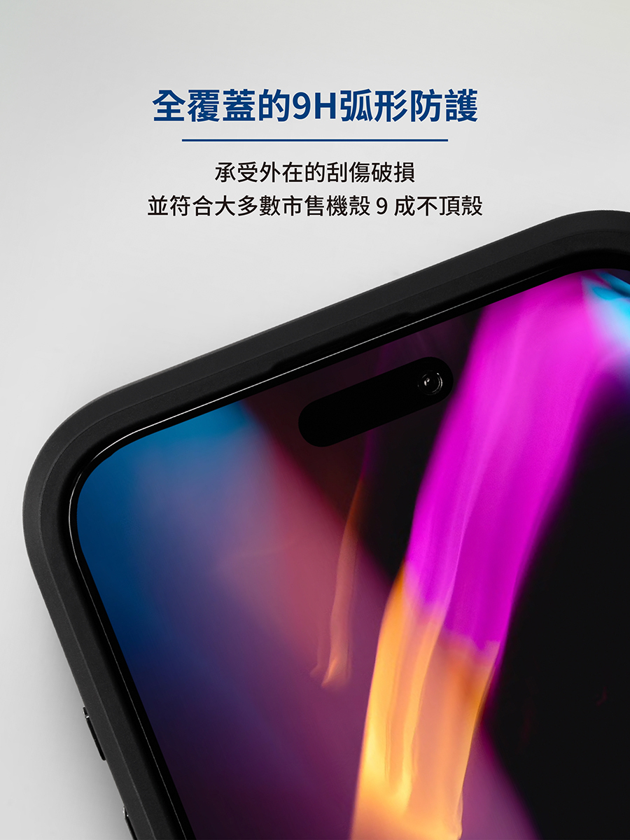 採用與原廠螢幕相同材質的康寧原材玻璃加工製作,滿版覆蓋 (已預留內縮空間以利相容保護殼),玻璃邊緣拋光精雕,使觸感一體成型柔嫩滑順,並大幅降低灰塵沾染的機會。硬度為強化玻璃最高的 9H 鉛筆硬度標準,多層次表面抗污塗層 AS 均勻分佈,與原廠螢幕擁有同樣的細緻綿密流暢觸感。