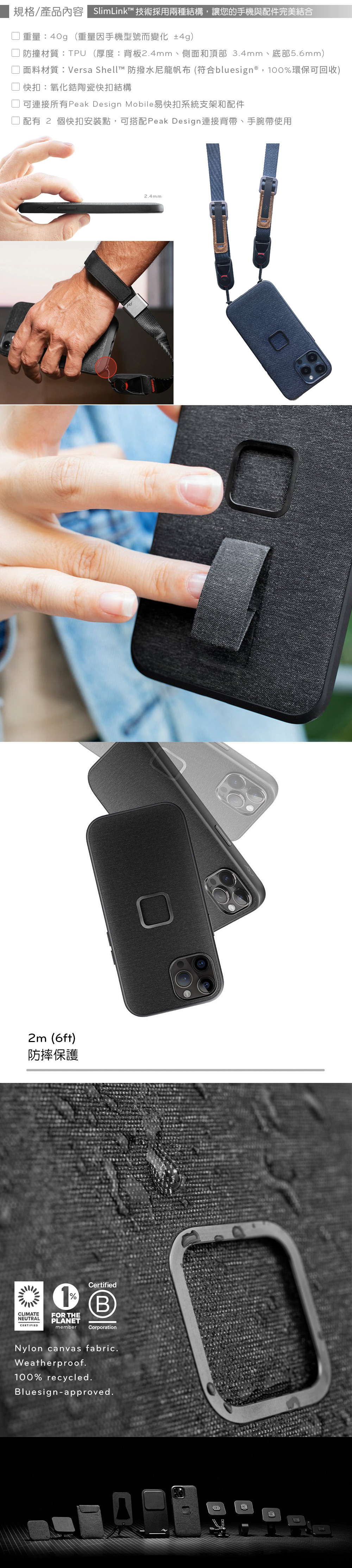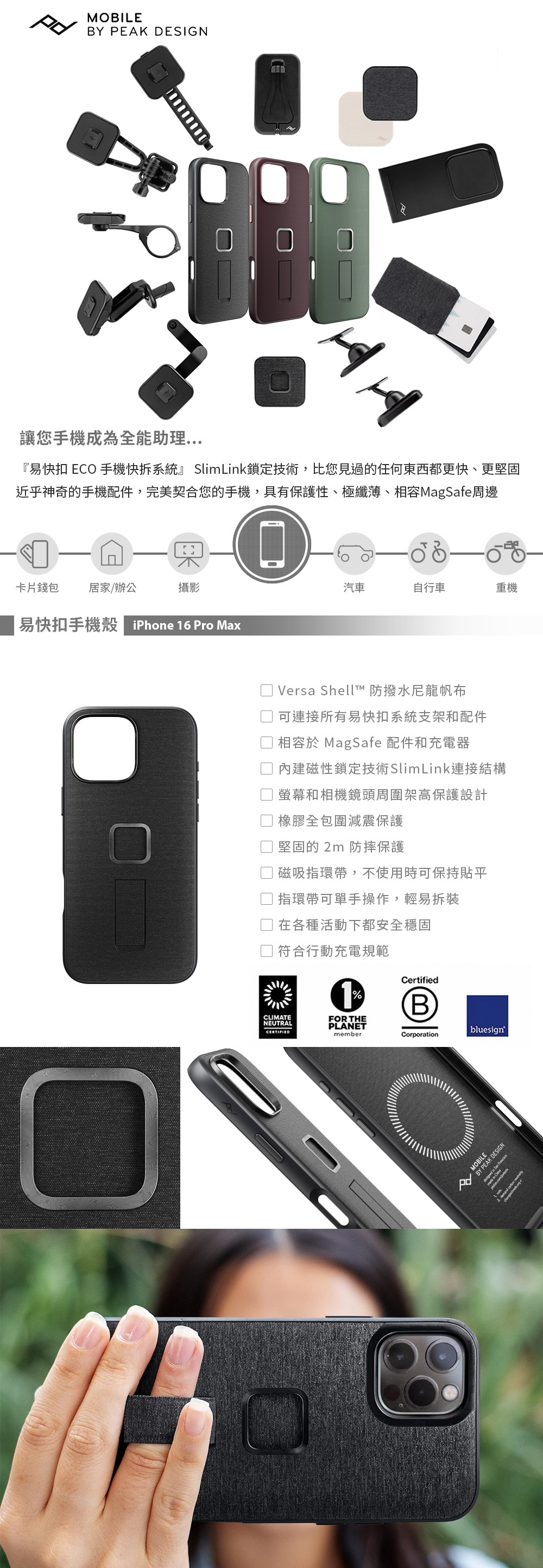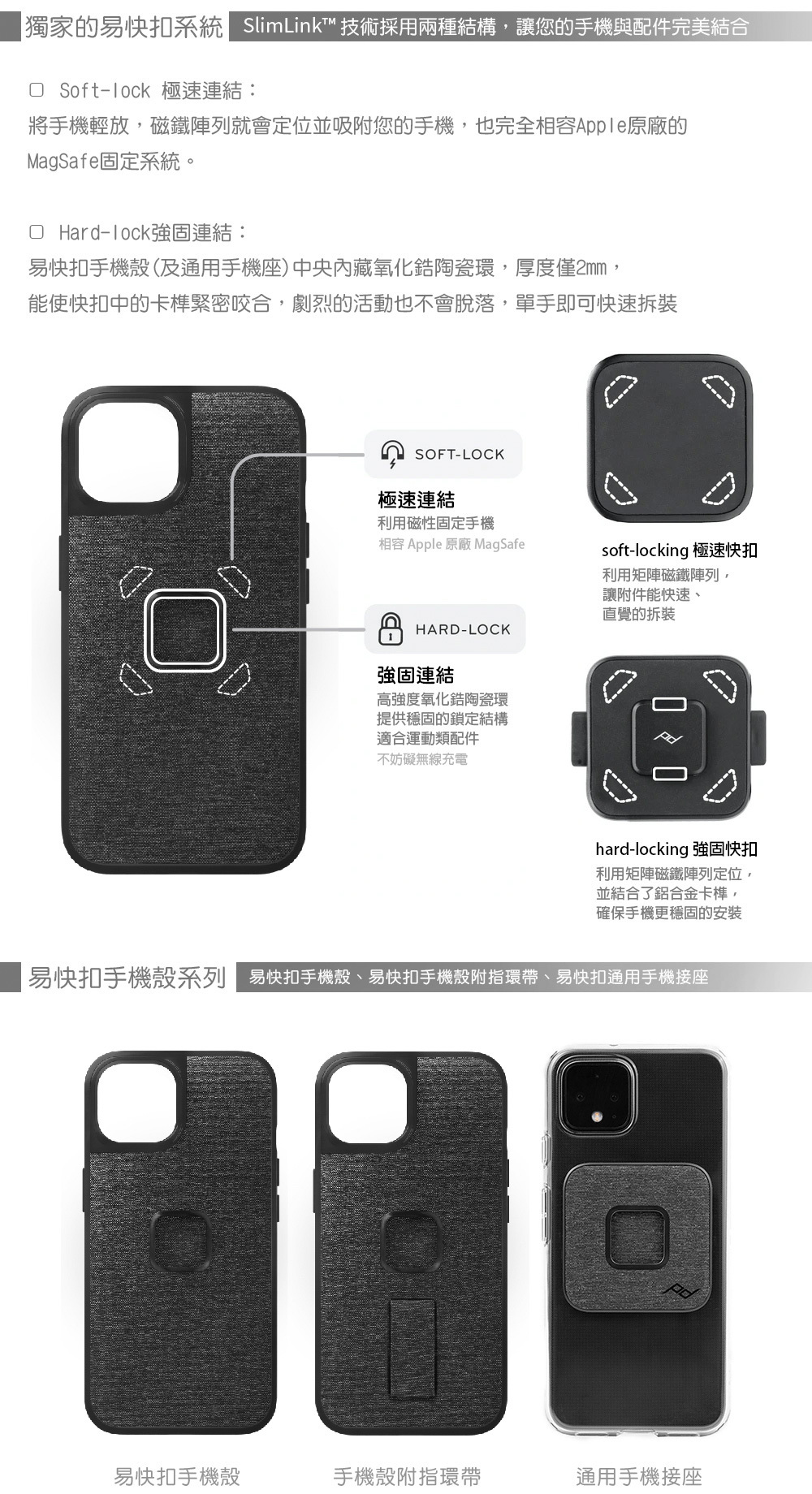 指環帶可單手操作,可磁吸保持貼平,專利SlimLink連接結構、單手輕易拆裝,比您見過的都更快、更堅固的手機配件,螢幕和相機鏡頭周圍架高保護設計,橡膠全包圍減震,堅固的 2m 防摔保護,超輕薄且保護性良好的手機殼、在各種活動下都安全穩固,相容於 MagSafe 配件和充電器,可搭配全套易快扣(ECO)相關配件使用。